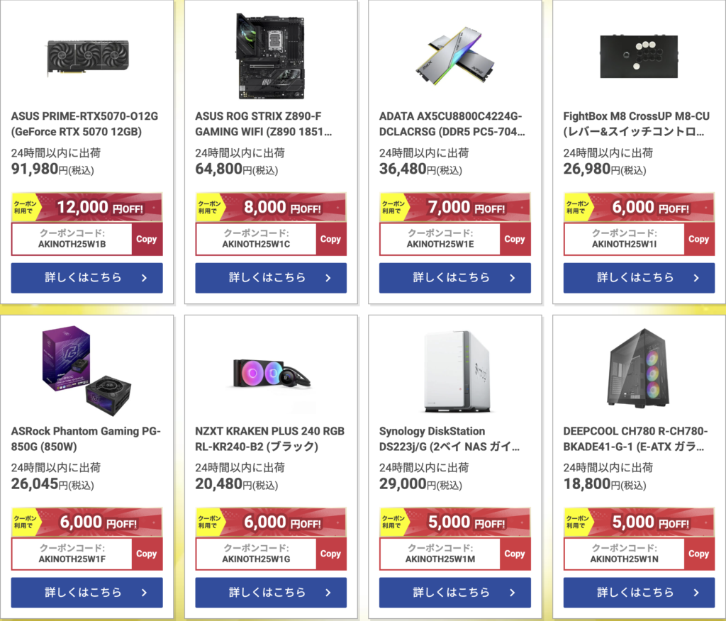 CPUクーラー、ケースファン、メモリ、電源ユニットなど、普段なかなか値下がりしないアイテムも注目です。