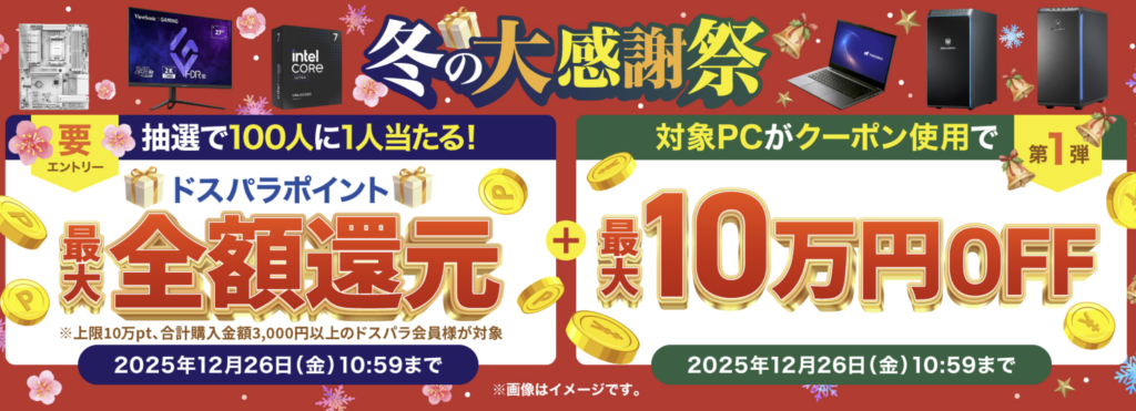 ドスパラでは現在、「冬の大感謝祭2025」を中心とした冬の大型キャンペーンが開催されています。