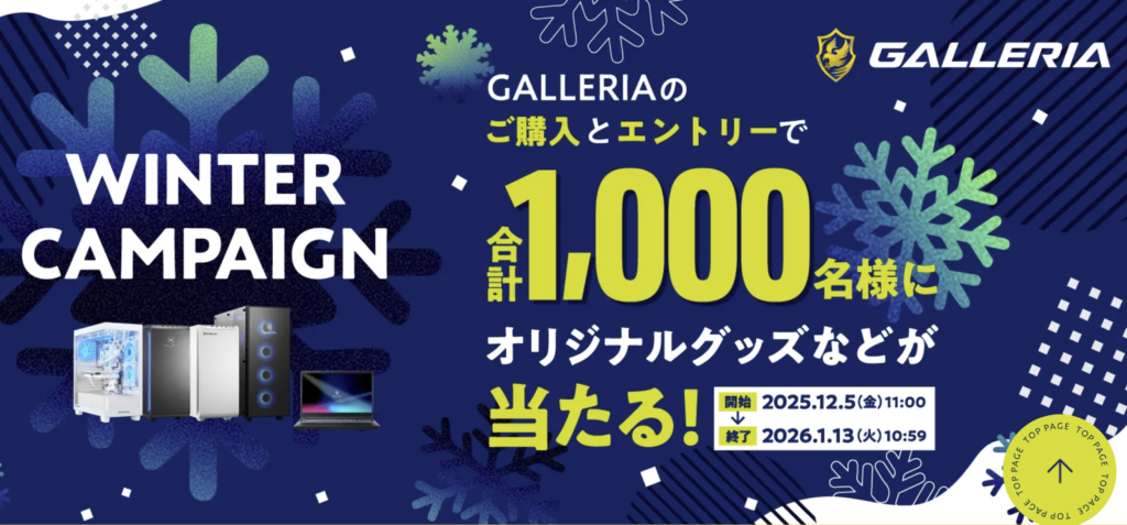 ゲーミングPCブランド「GALLERIA」を対象にした「WINTER CAMPAIGN 2025」も開催されています。